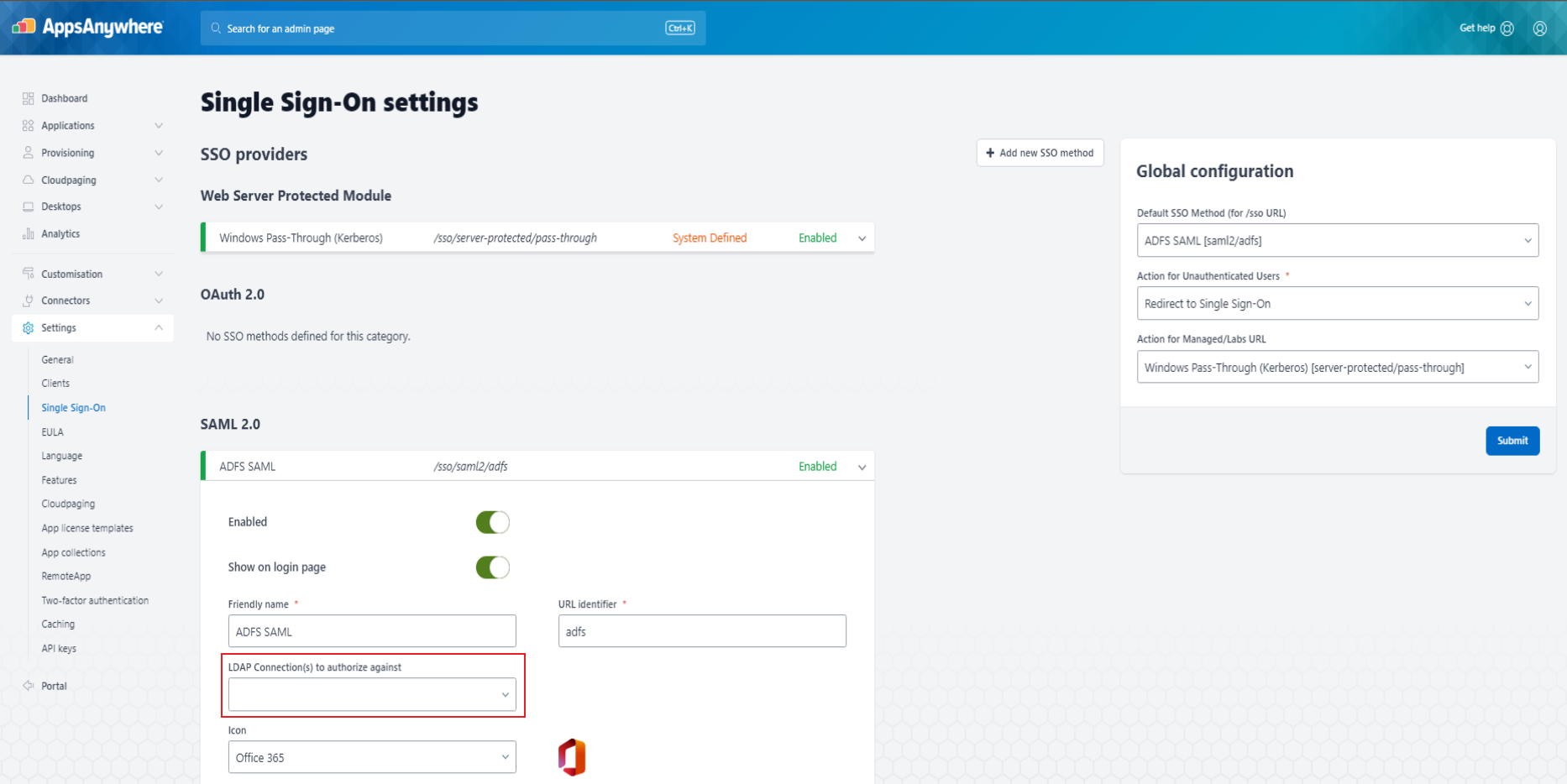 Federated Domain Aliases | In the event your users authenticate using a federated domain alias (i.e. the domain name portion of their login does not have a represented domain within your infrastructure) and only a single LDAP connection has been selected, a value for this field will be required in order for AppsAnywhere to know that this part of their login is not a real domain. Note: This field is not required or used when no or more than one LDAP connection is selected. Any federated domain values specified in this field will be ignored in this case. Domain aliases can also be specified on the LDAP connection itself. | A list of valid domain names that corresponds to the federated aliases used in your user's usernames, e.g. myalias.com If the domain found in the username matches this set value, then it will be ignored, and the domain associated with the selected (single) LDAP connection will be used instead. These should be seperated by semi colons, e.g. myalias.com;anotheralias.com |