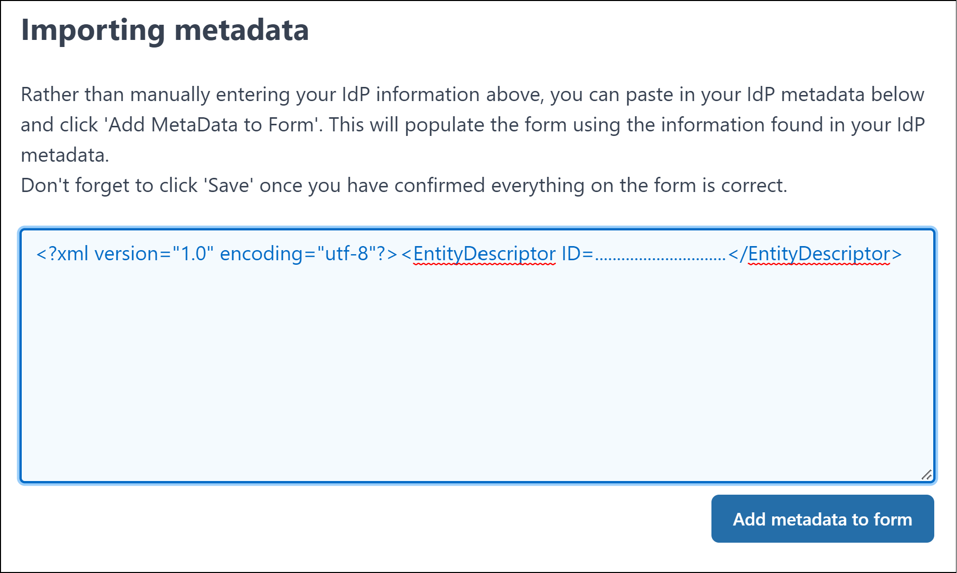Paste the Federation Metadata XML file content into the Importing MetaData field
