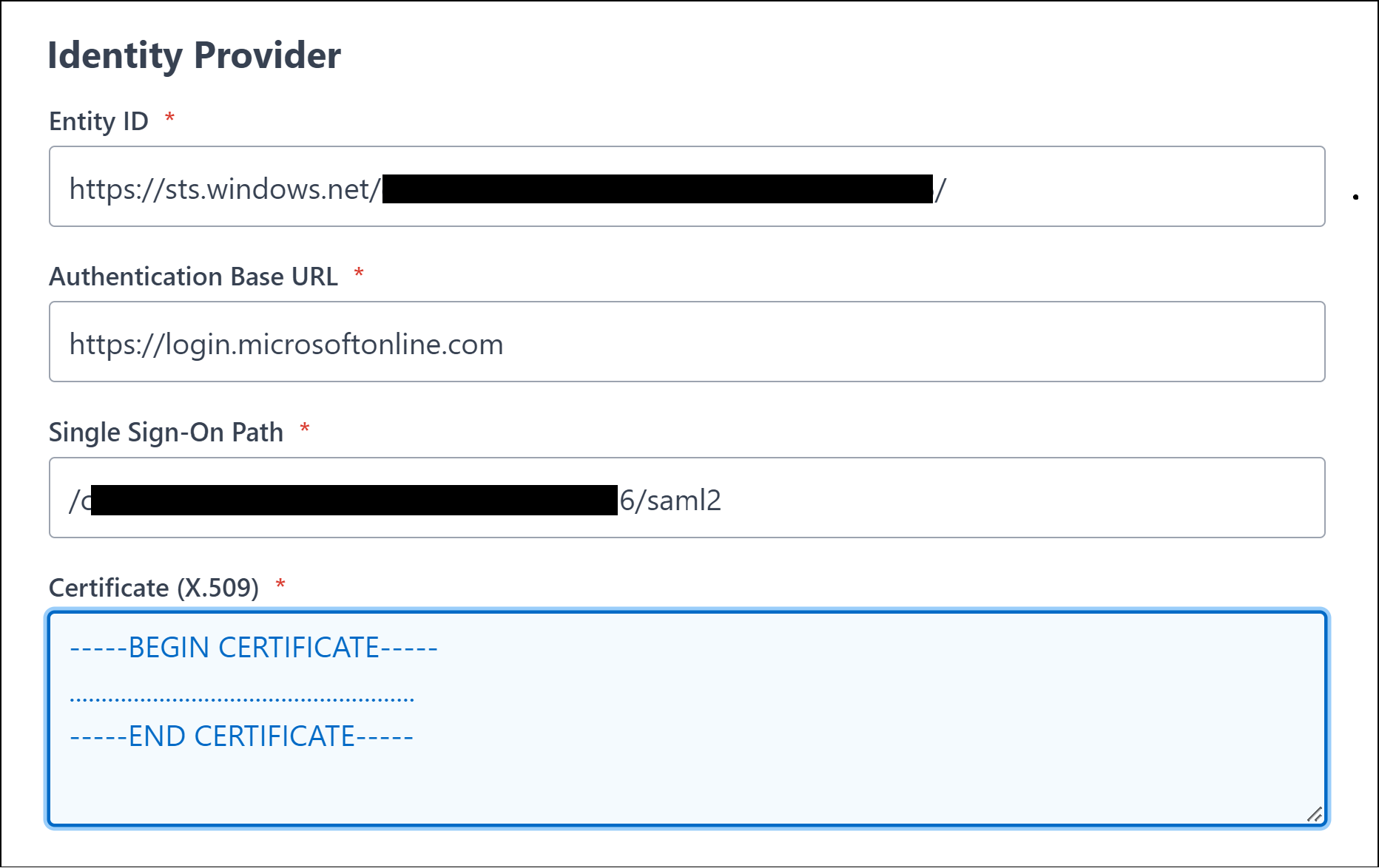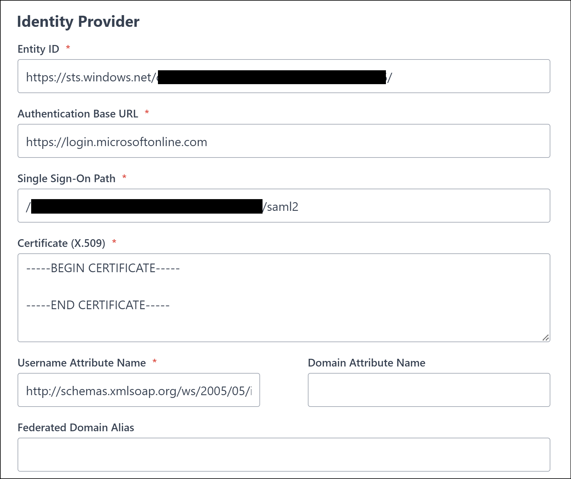 Enter the required values into the Identity (Entity ID) and Reply URL (Assertion Consumer Service URL) fields.