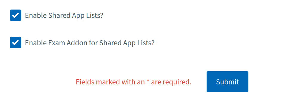 Find the checkbox Enable Exam Addon for Shared App Lists? and check it if you would like to enable all exam functionality, or uncheck it if you would like to disable it for Shared App Lists.