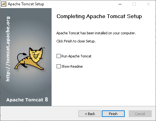 At the Completing Apache Tomcat Setup screen, uncheck Run Apache Tomcat and click Finish