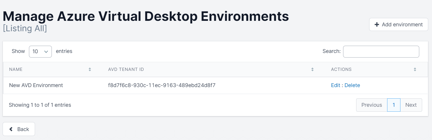 Click the Delete button next to an environment to delete that environment - See Deleting an Azure Virtual Desktop Environment