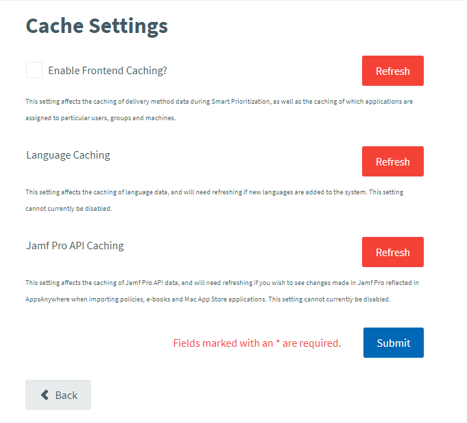 This setting affect the caching of Jamf Pro API data, and will need refreshing if you wish to see changes made in Jamf PRO reflected in AppsAnywhere when importing policies, e-books and MAC App Store applications. This setting cannot currently be disabled.