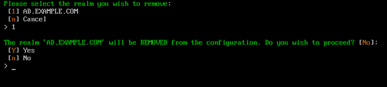 A list of currently known Kerberos realms will be displayed. Type the corresponding number to the realm you want to remove and press Enter.