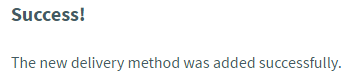 If the save was successful, you will see the a success message appear above the form and your new delivery method will be added to the bottom of the list on the left-hand side.