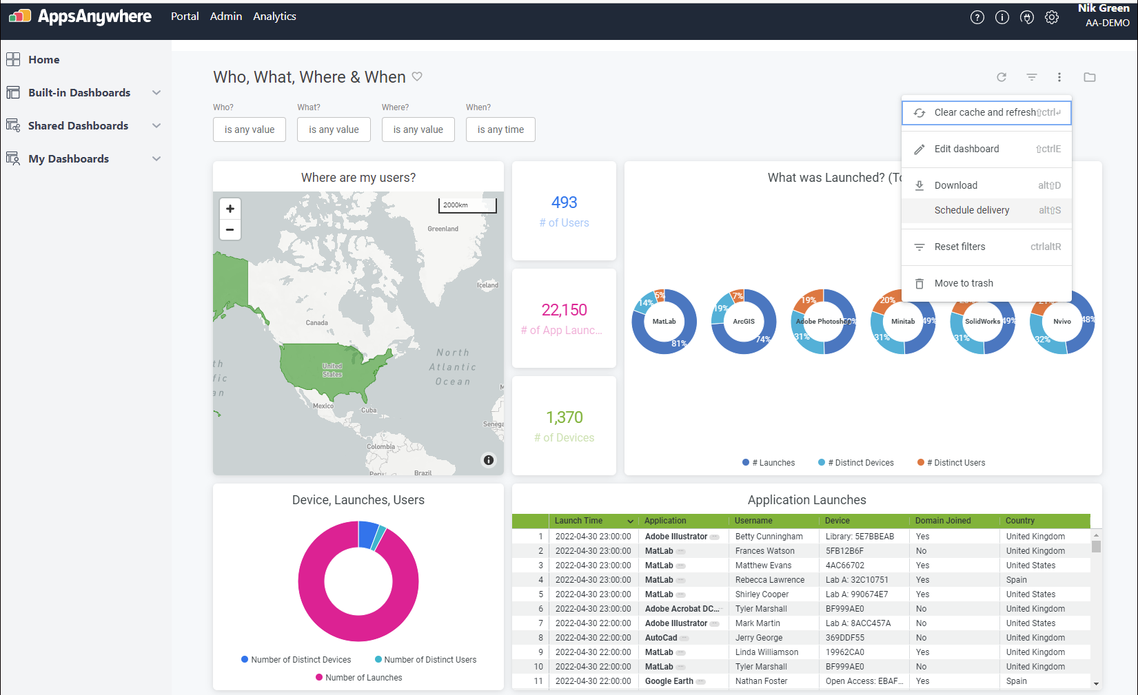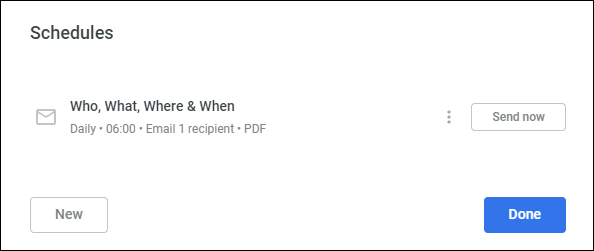 The Task is now listed. You can create multiple scheduled tasks based on the same dashboard to different recipients and by using the filters change the data being reported on.