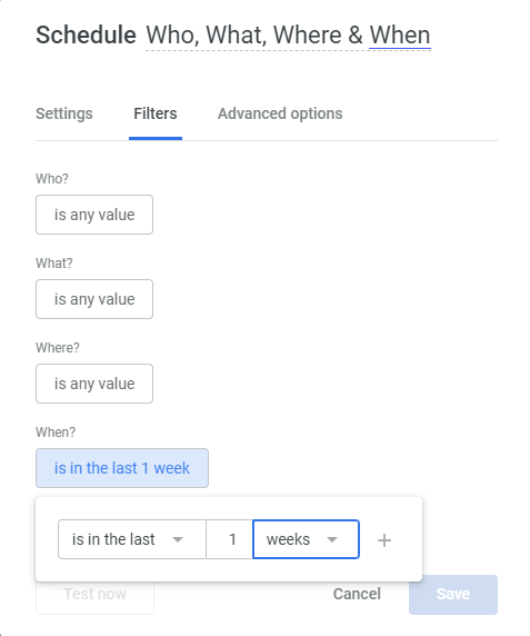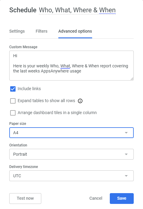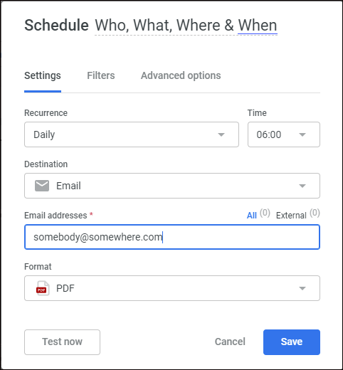 You can use the Test Now option to send a copy of the report to the emails you have specified to verify the look and feel of your report and when happy press Save.